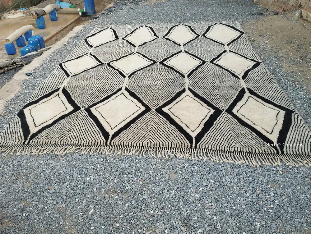 Pattern: Iconic black/dark brown Berber diamond (lozenge) lattice on a natural ivory background.