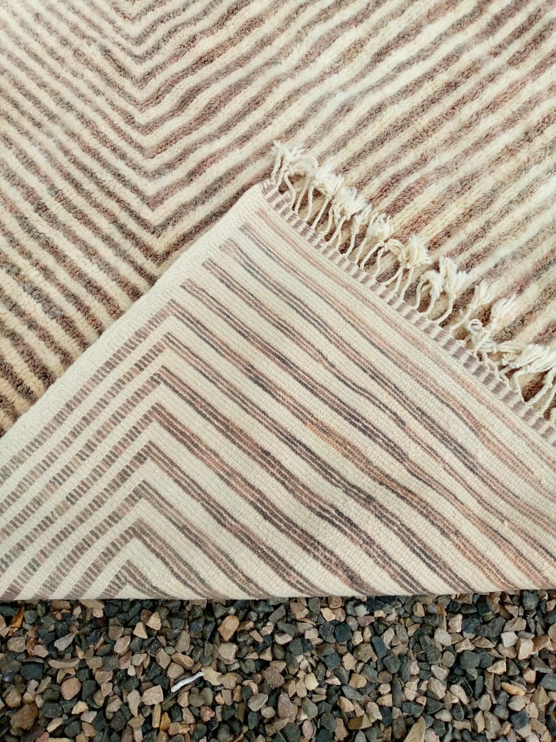 Explore our handmade Beni Mrirt Moroccan Rug – INAR, crafted in the Middle Atlas Mountains of Morocco from authentic organic wool and natural dyes. Our modern century design features a plush weave with striped beige pattern, ensuring each rug is unique. Choose from single or double-sided fringe options. Handmade in Morocco with a lead time of 8 to 10 weeks.