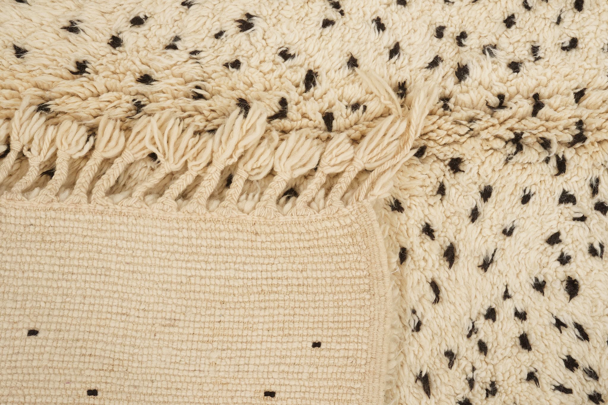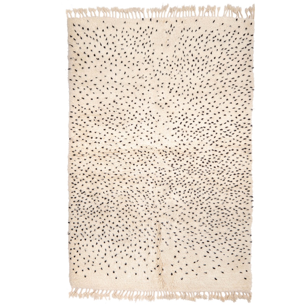 - Design: Beni Ourain Polka Dot: A minimalist, plush ivory wool rug featuring hand-knotted charcoal speckles, handcrafted in any size at our Berber Creations workshop.