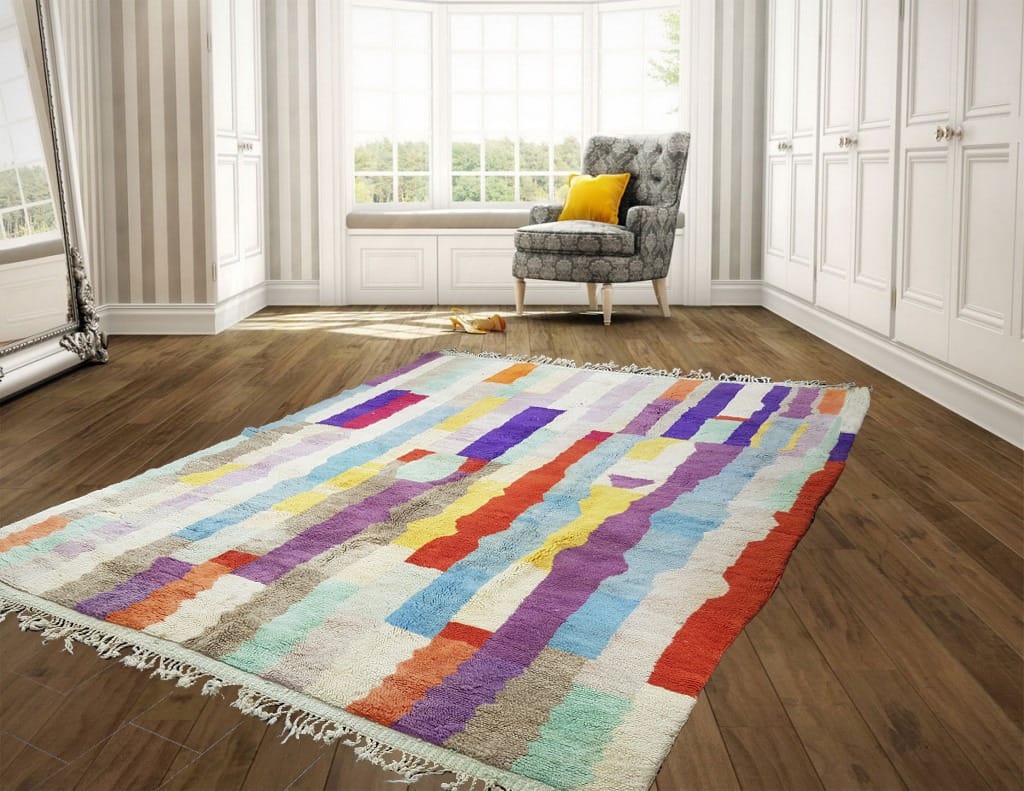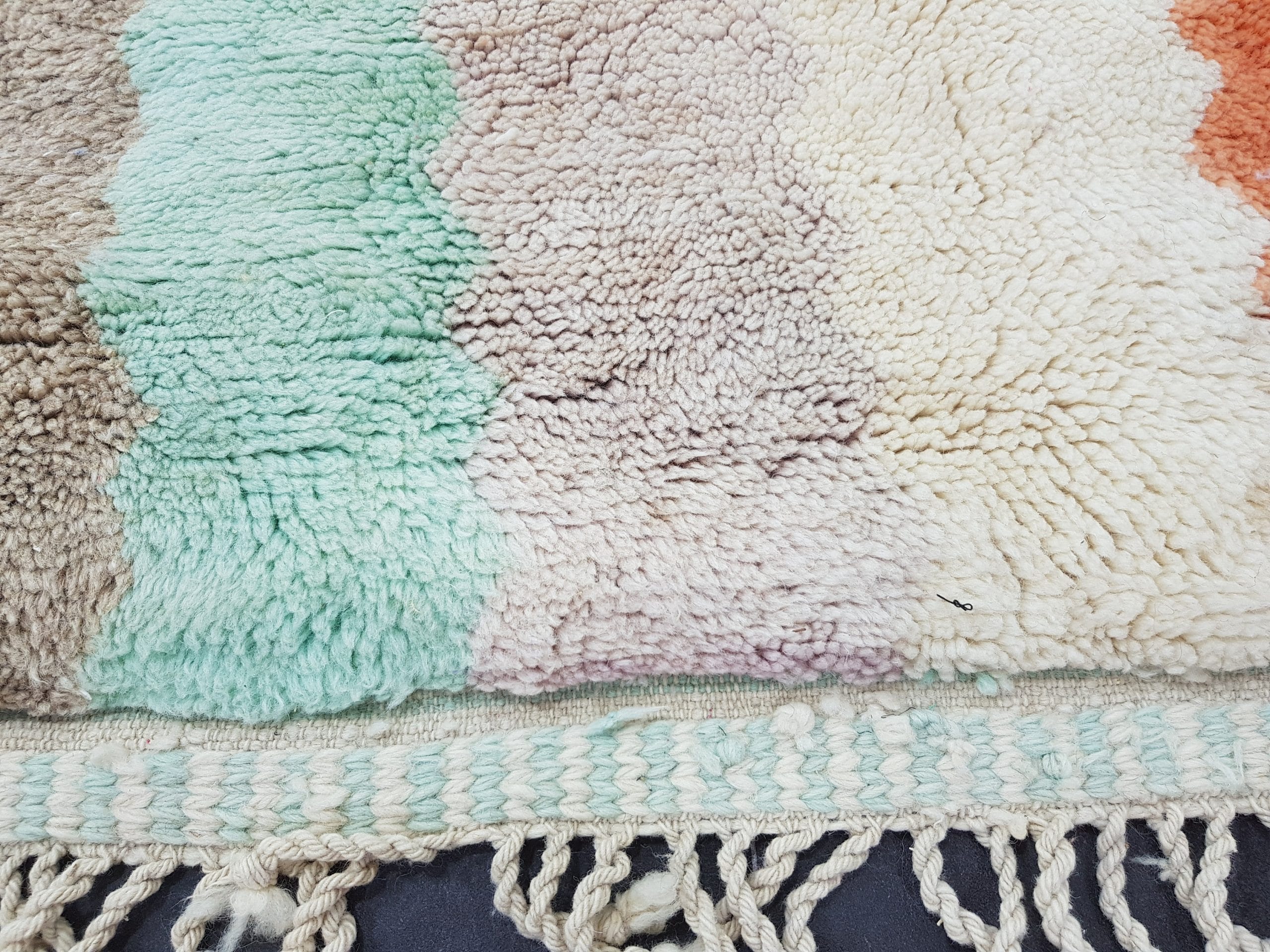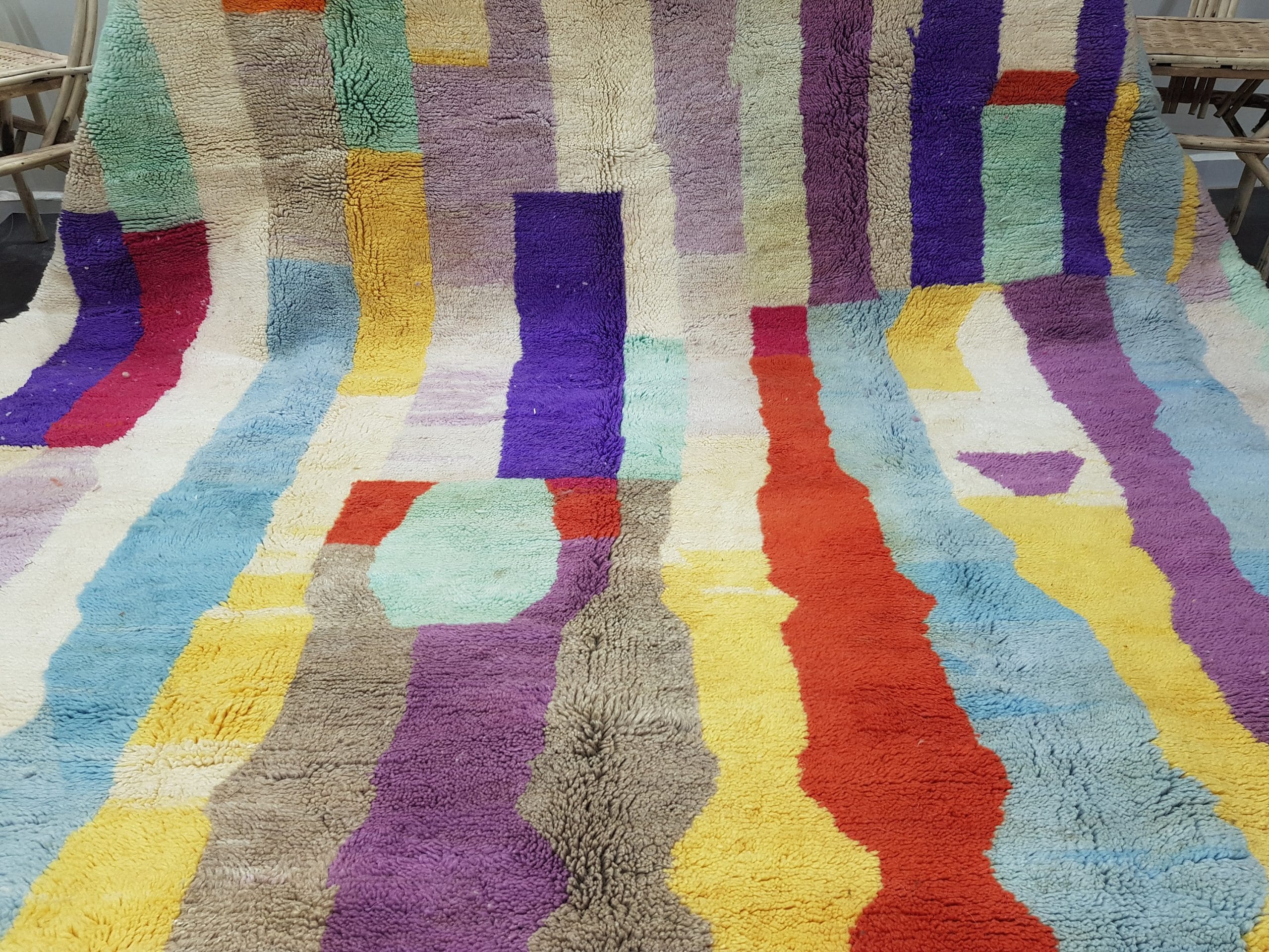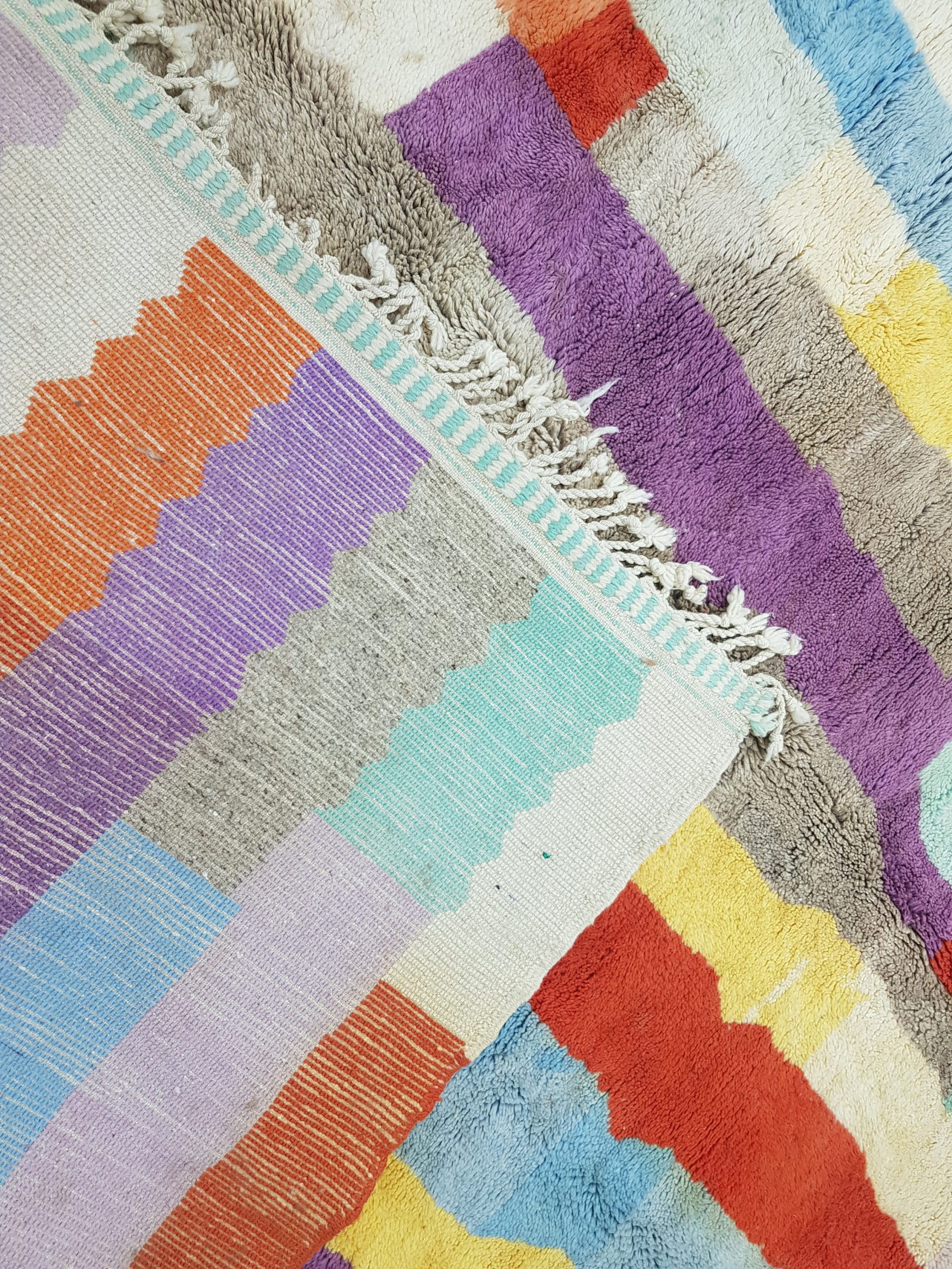 Dive into the vibrant world of our Beni Ourain ZAHRA rug. Hand-knotted by Berber artisans, this masterpiece of colorful natural wool brings unique character and joy to your interior. Each rug is a one-of-a-kind piece of art, designed to tell a story in your home.