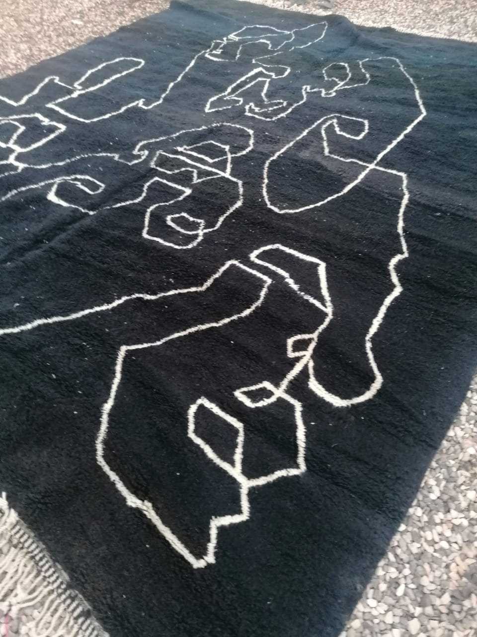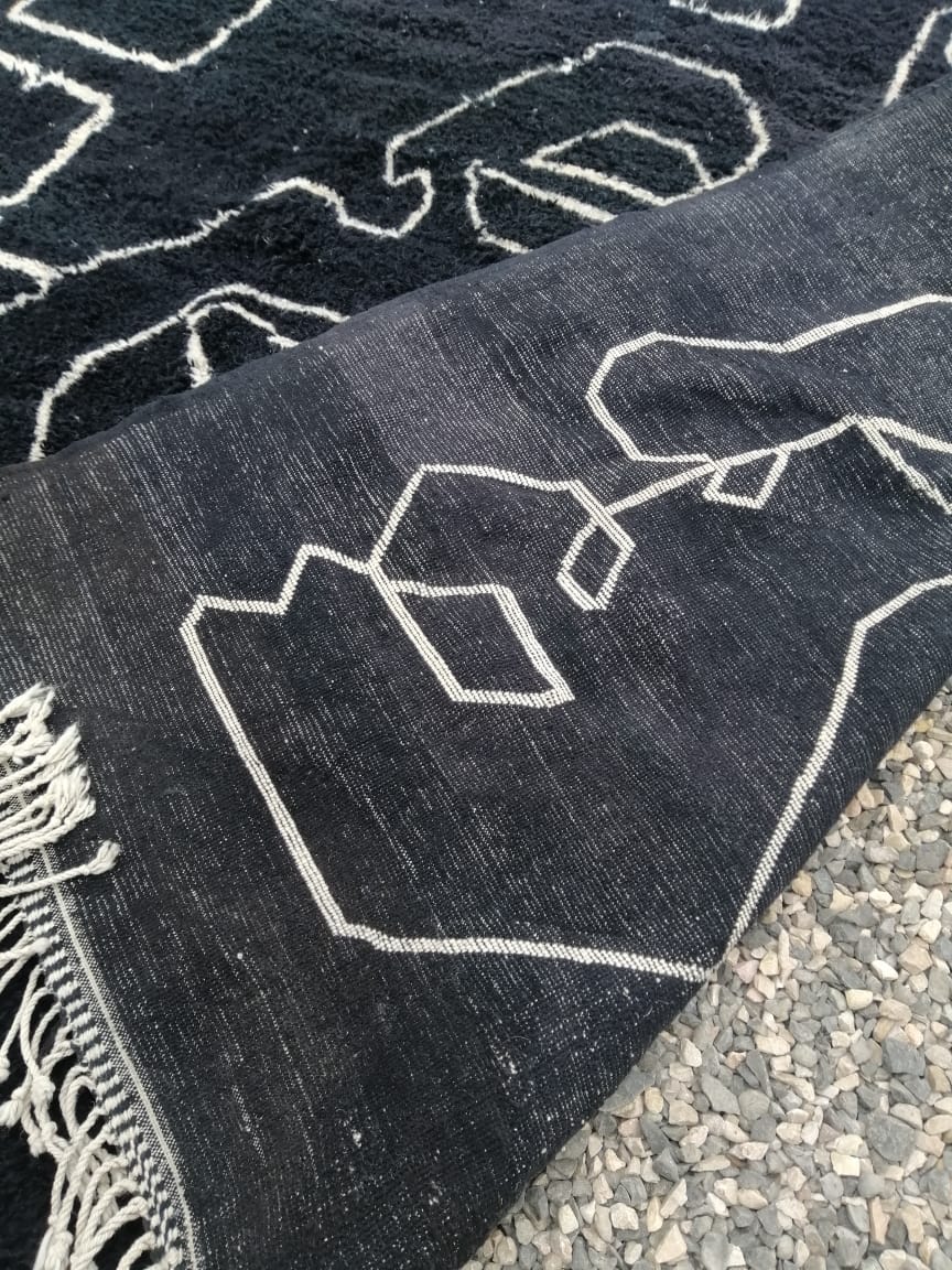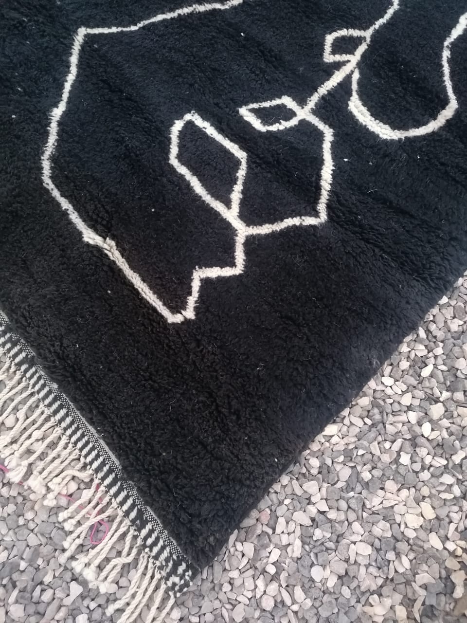 This Black Moroccan Wool Rug With White Design is made by a woman of the Berber tribes in the High Atlas Mountains of Morocco.