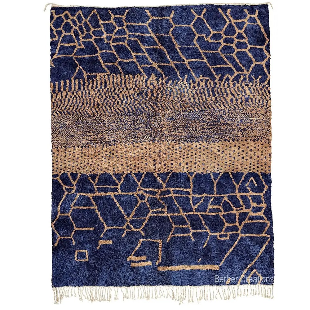 A custom-made Moroccan Berber rug featuring a unique, segmented design of abstract bands in rich blue and natural beige. Hand-knotted from soft, natural wool, this rug is a statement piece.