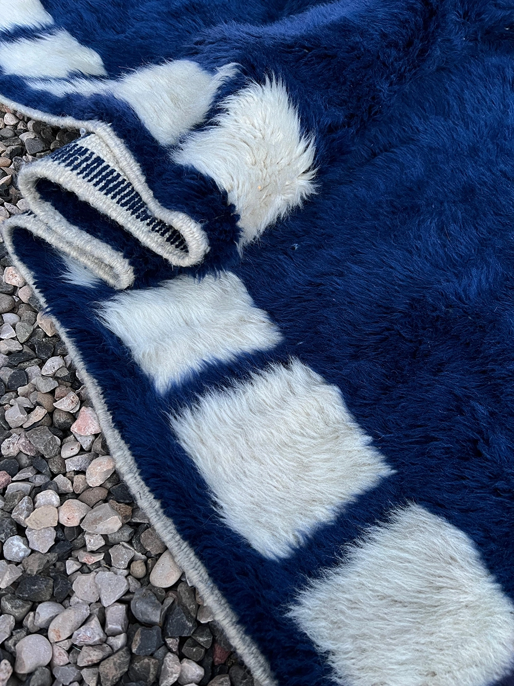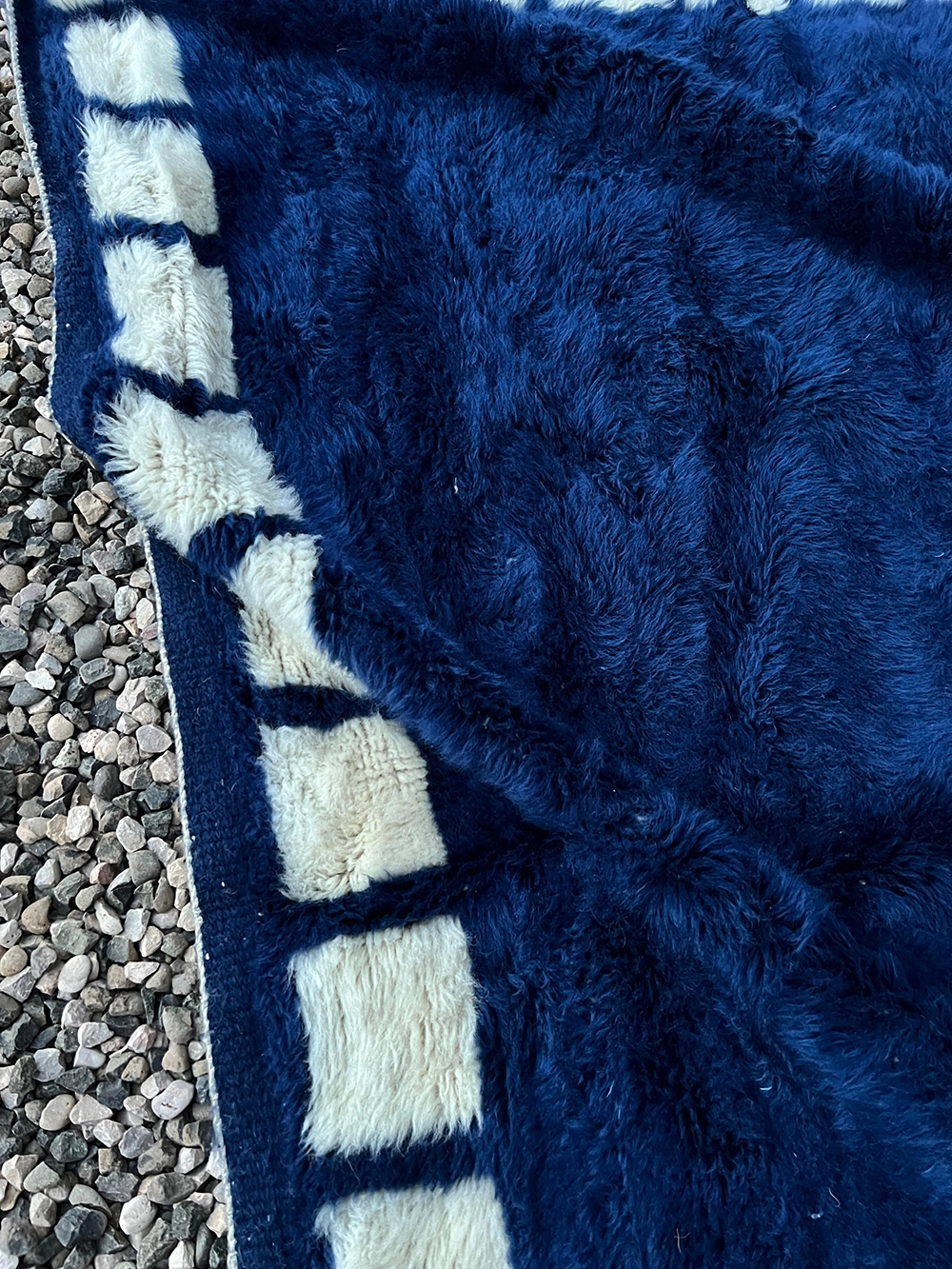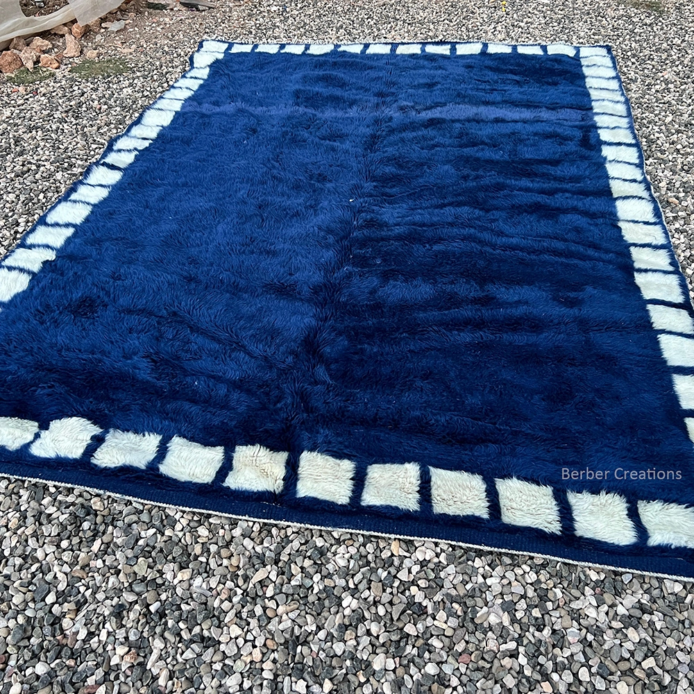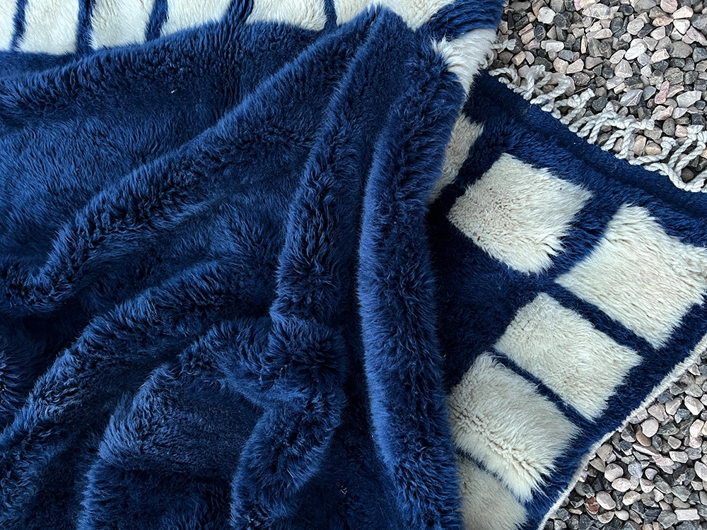 Colors: The palette is centered on a saturated deep midnight blue contrasted with natural ivory white blocks. The premium M’rirt wool provides the blue field with a rich, multi-tonal depth and a subtle silky sheen.