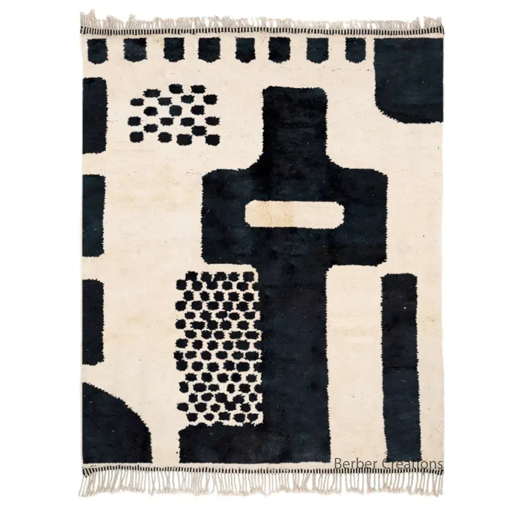 Immerse yourself in the epitome of luxury and modern allure with our Handmade Moroccan Rug Black and White – SOULIMA . This meticulously crafted masterpiece seamlessly blends traditional Moroccan geometric patterns with a contemporary design aesthetic. Elevate your living space with the timeless combination of peach and white tones, creating a sophisticated ambiance that complements any decor style.