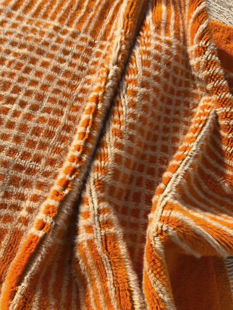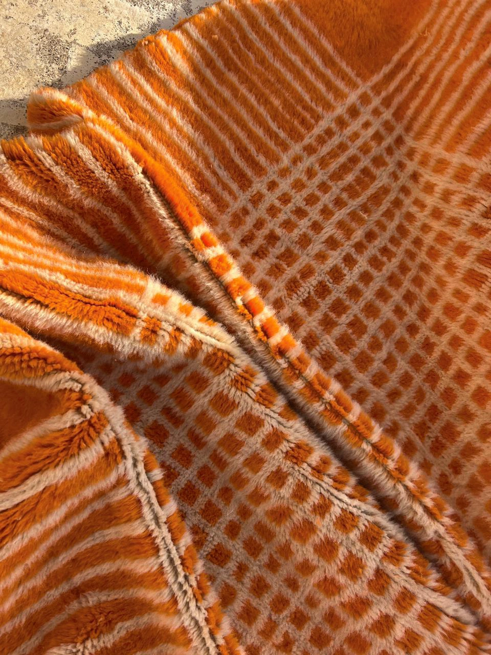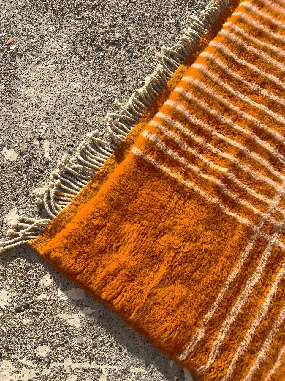 Inject vibrant energy into your space with this Modern Orange Moroccan Rug. Hand-knotted from 100% premium wool, it features a striking tangerine-orange field accented by a structured, creamy-white geometric grid. Its plush pile and architectural design offer a perfect blend of traditional Berber warmth and contemporary style, making it a bold statement piece for any room.