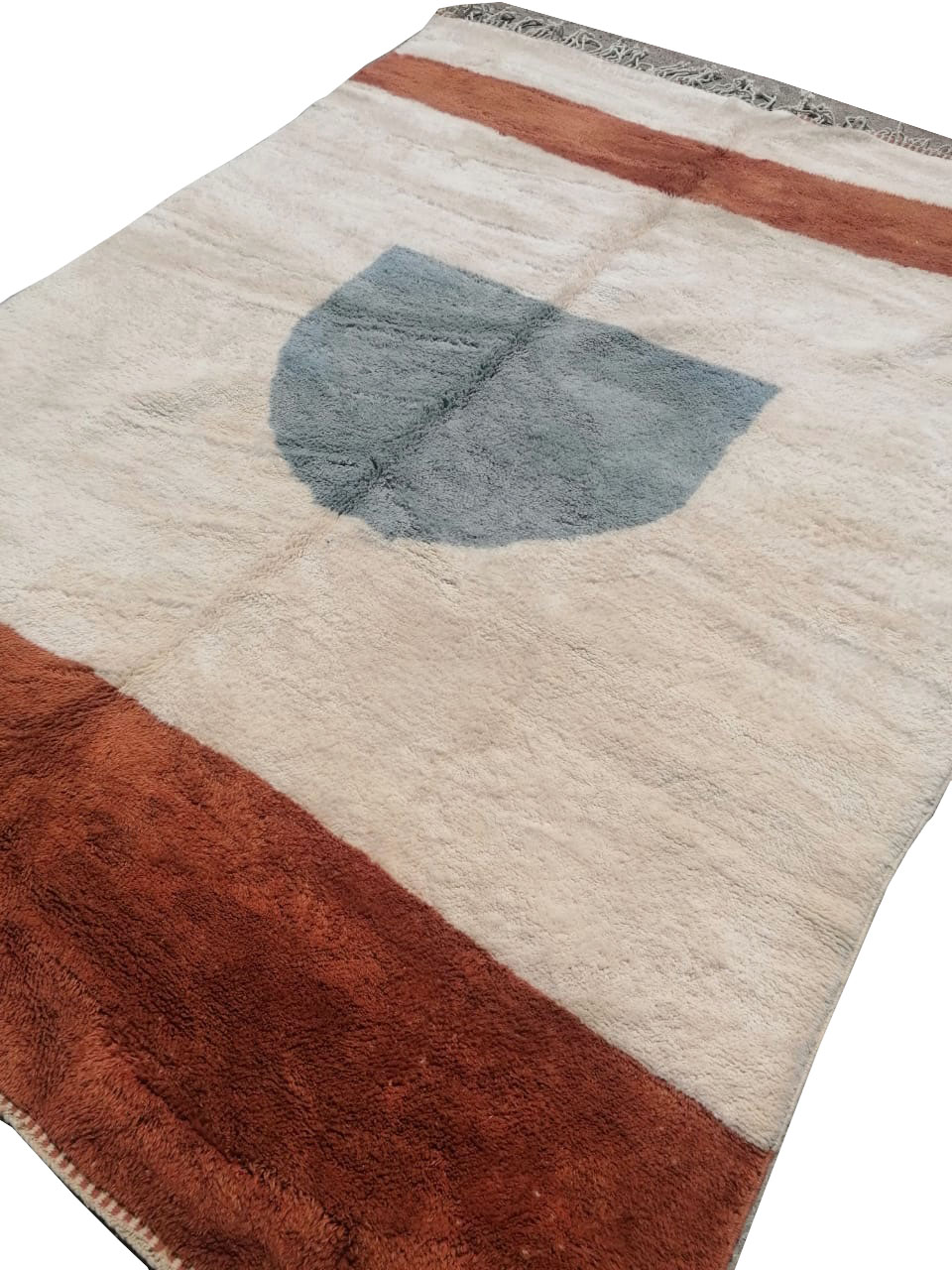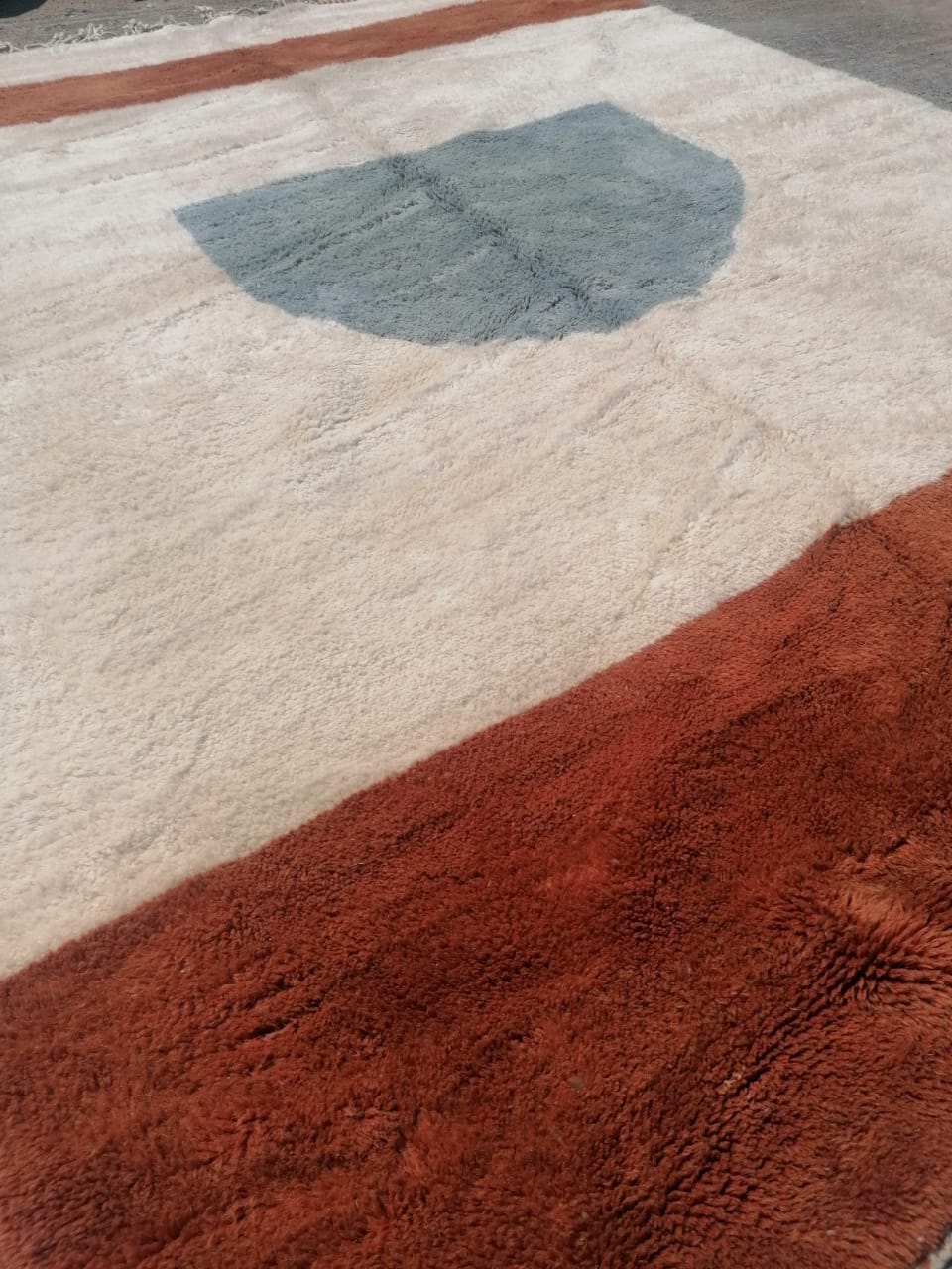 This Moroccan Beni Mrirt rug Cream/ Orange /Blue was made by a woman of the Berber tribes in the High Atlas Mountains of Morocco.