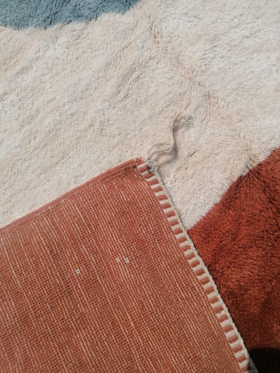 This Moroccan Beni Mrirt rug Cream/ Orange /Blue is made by a woman of the Berber tribes in the High Atlas Mountains of Morocco.