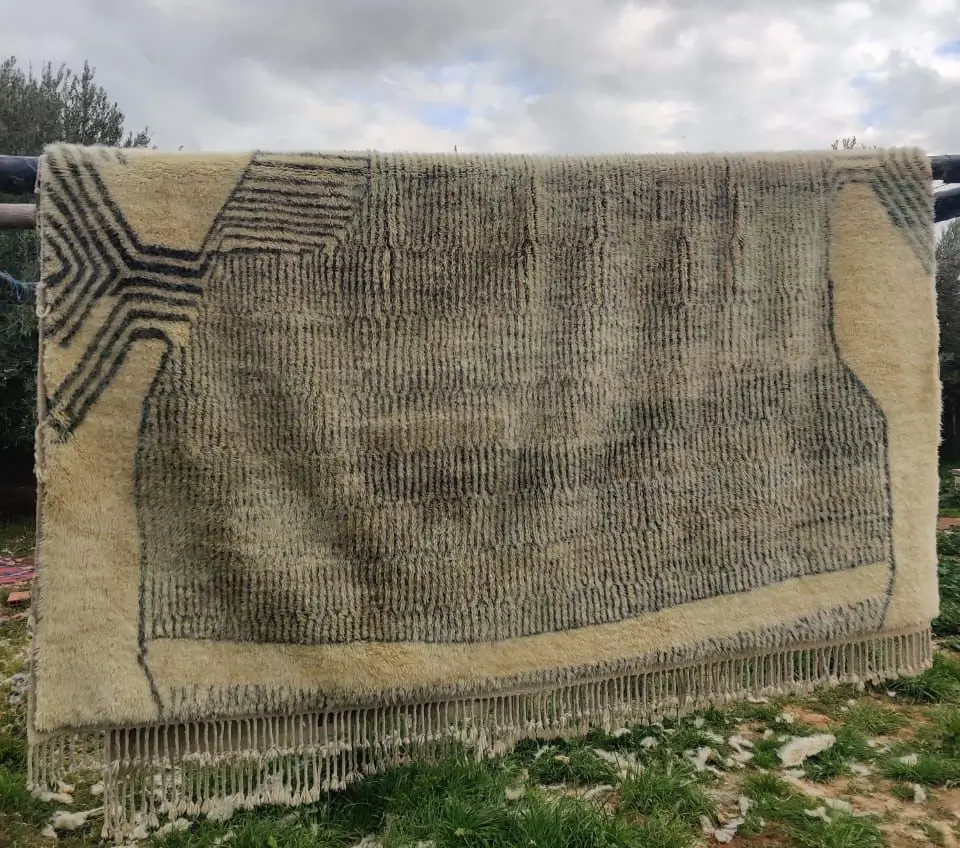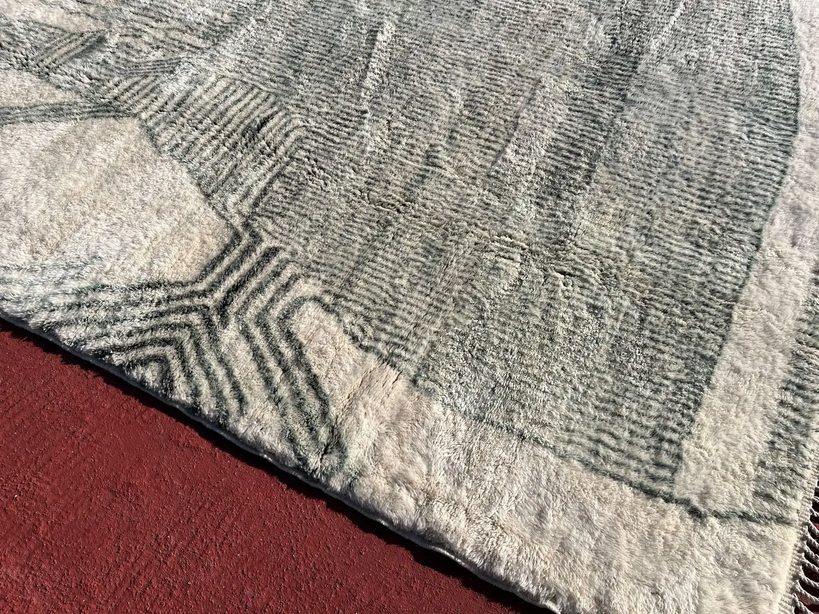“Atlas Columns” is a handwoven Moroccan Beni Mrirt rug crafted in soft cream wool with gray and orange geometric accents. Luxurious high-pile texture and timeless Berber craftsmanship.