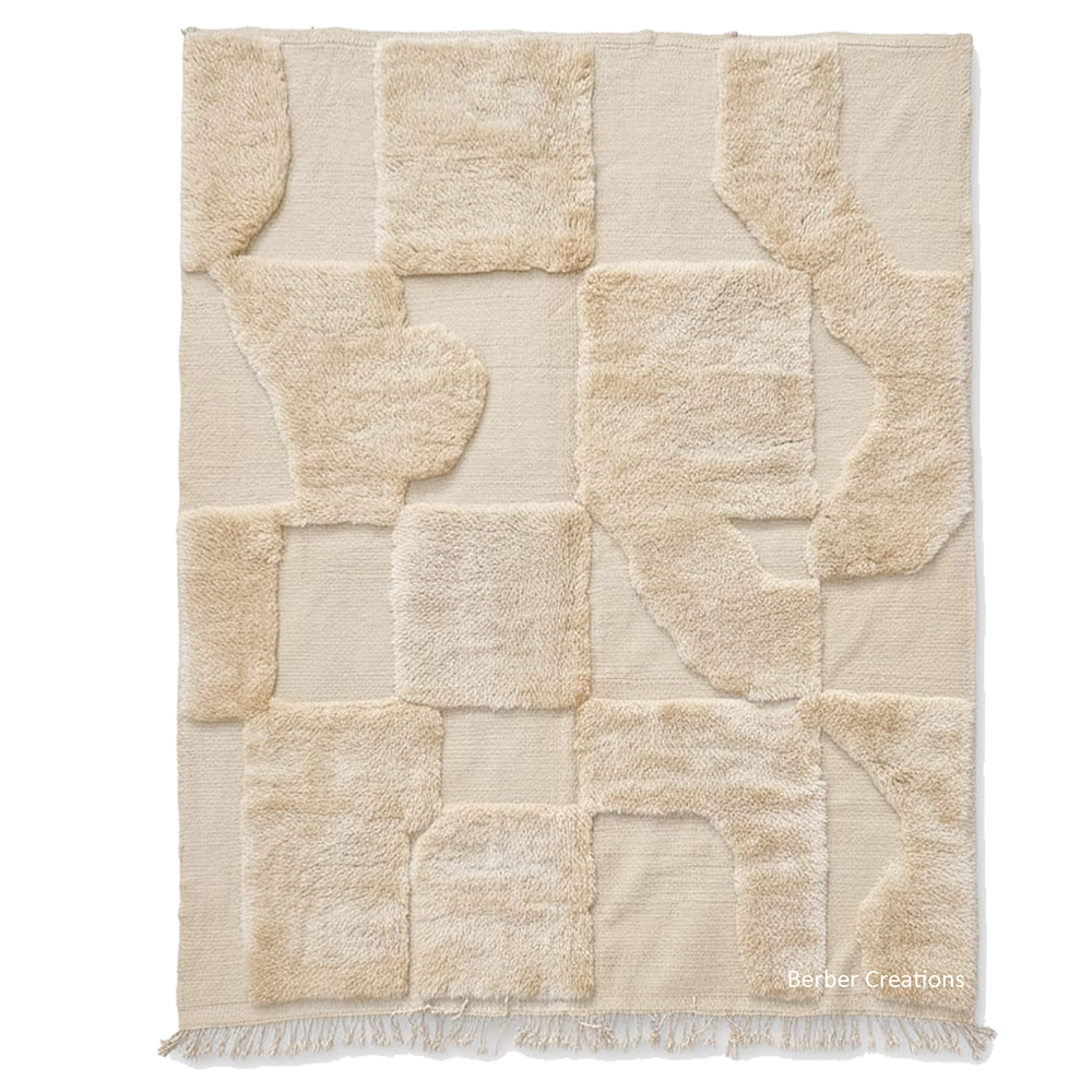 The Saharan Mirage is a luxury Moroccan handmade Beni Ourain rug featuring a 3D textured high-low pile. Crafted in our Berber Creations workshop from 100% organic wool, this neutral masterpiece is custom-made at any size.