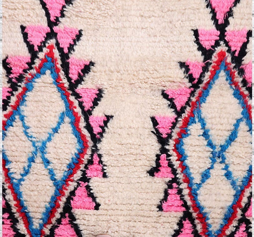 Introducing our exquisite Pink Moroccan Azilal Rug with a timeless Diamond Pattern on a Cream Background, accentuated by delicate Pink and Blue diamond motifs. Crafted with the utmost precision, this rug is a true masterpiece, designed to enhance the elegance and charm of your living space.