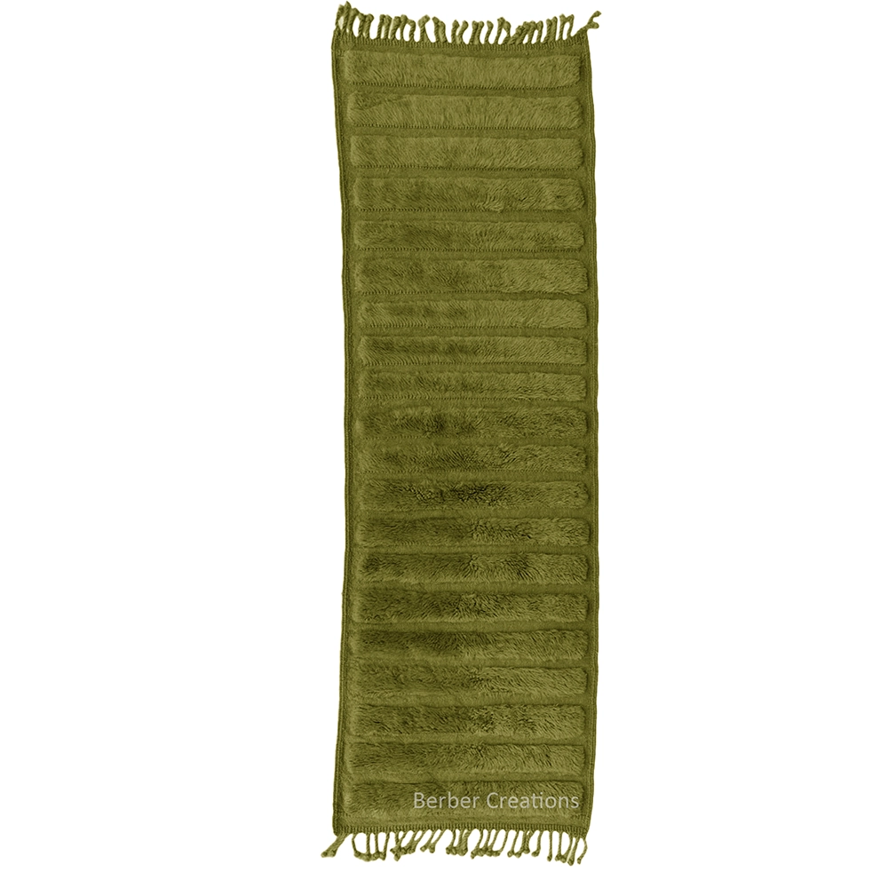 This striking Modern Moroccan Rug features a lush Olive Green central field framed by bold, high-contrast Black and Cream vertical striped borders. Hand-woven from soft, plush wool, this piece adds both cozy texture and sharp geometry to your space.