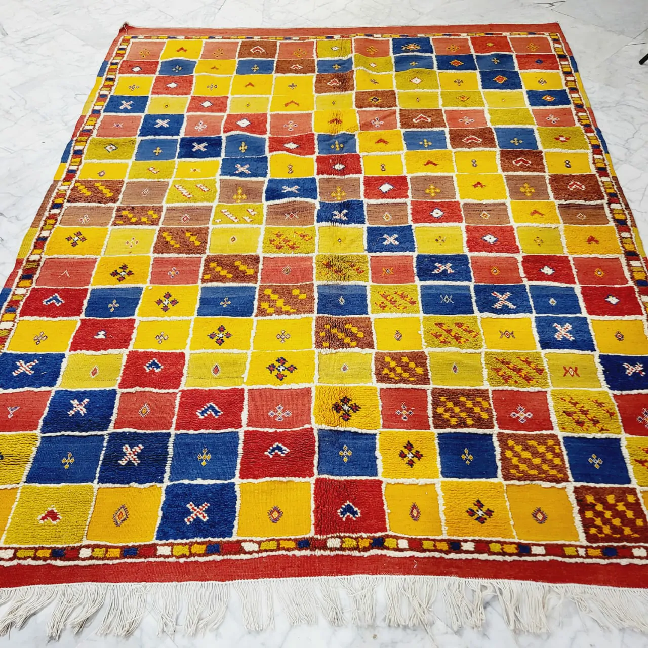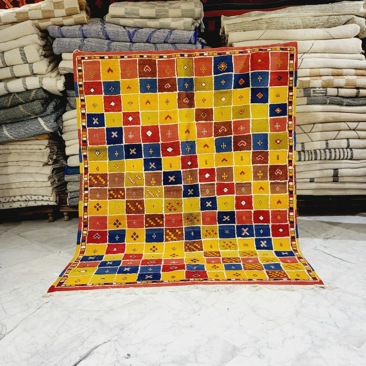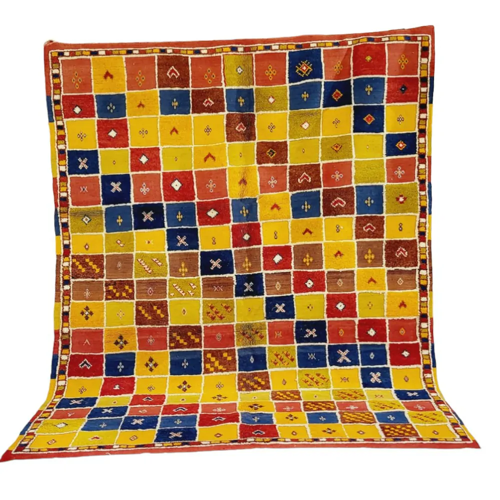 Introducing our Taznakht Rug – a cultural masterpiece deeply woven into the identity of Taznakhte. More than an artisanal product, it reflects a centuries-old tradition, mirroring a lifestyle in vibrant colors and captivating images.