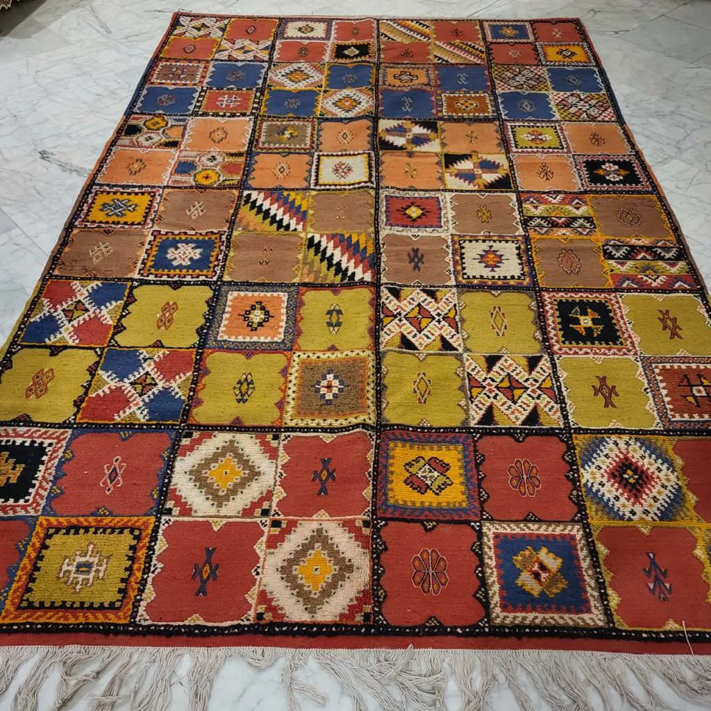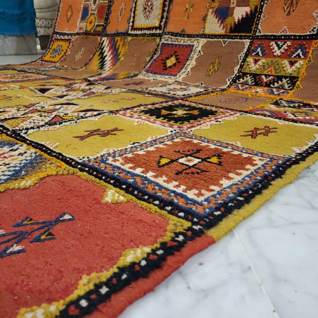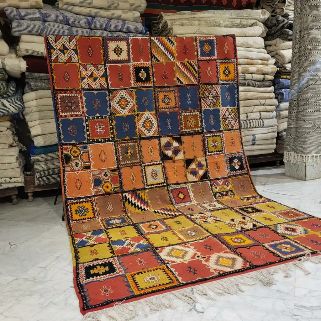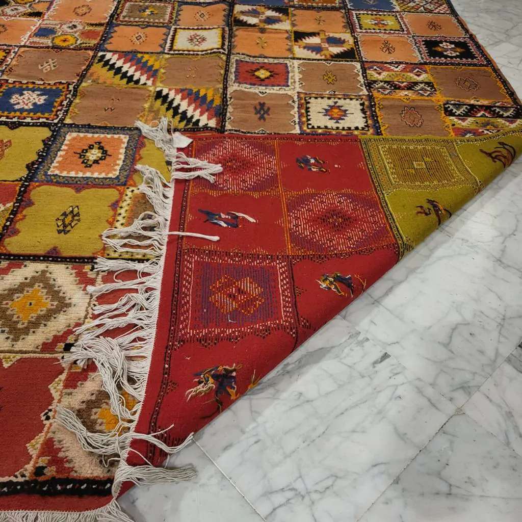 Introducing our Taznakht Rug – a cultural masterpiece deeply woven into the identity of Taznakhte. More than an artisanal product, it reflects a centuries-old tradition, mirroring a lifestyle in vibrant colors and captivating images.
