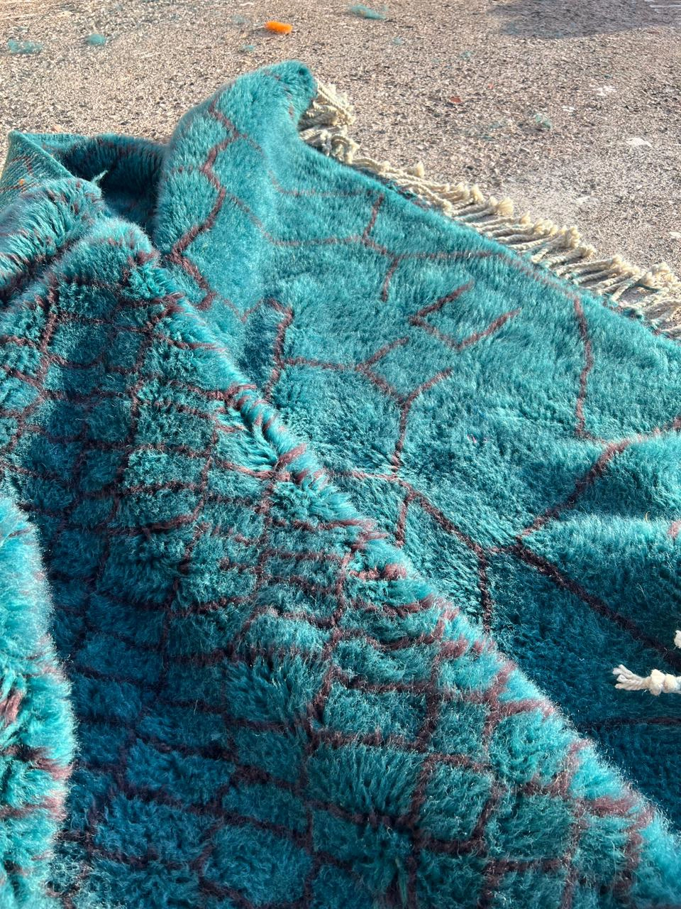 Make a bold statement with this Hand-Knotted Teal Moroccan Rug. Drenched in a rich petrol-blue hue, this authentic Berber rug features a striking charcoal-black abstract lattice design. Crafted from 100% premium Atlas Mountain wool, its plush pile offers a luxurious feel that seamlessly blends traditional craftsmanship with a moody, modern aesthetic.