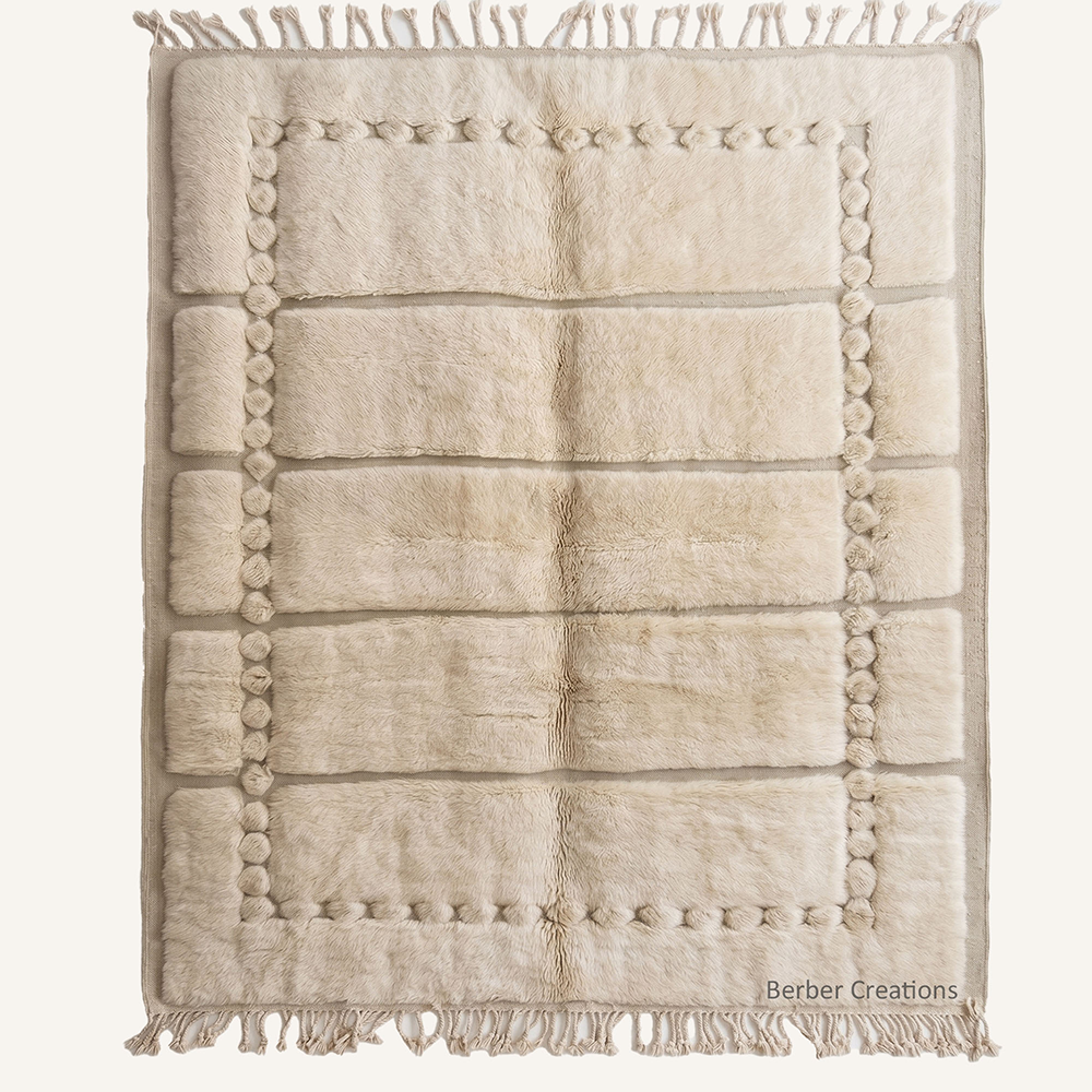 The Pearl Parchment is a producer-direct masterpiece in monochromatic Ivory. Featuring a distinctive 3D pom-pom border and elegant paneled texture, this rug is hand-knotted in our workshop from 100% organic Atlas wool. A perfect example of “Quiet Luxury,” available in any custom size.