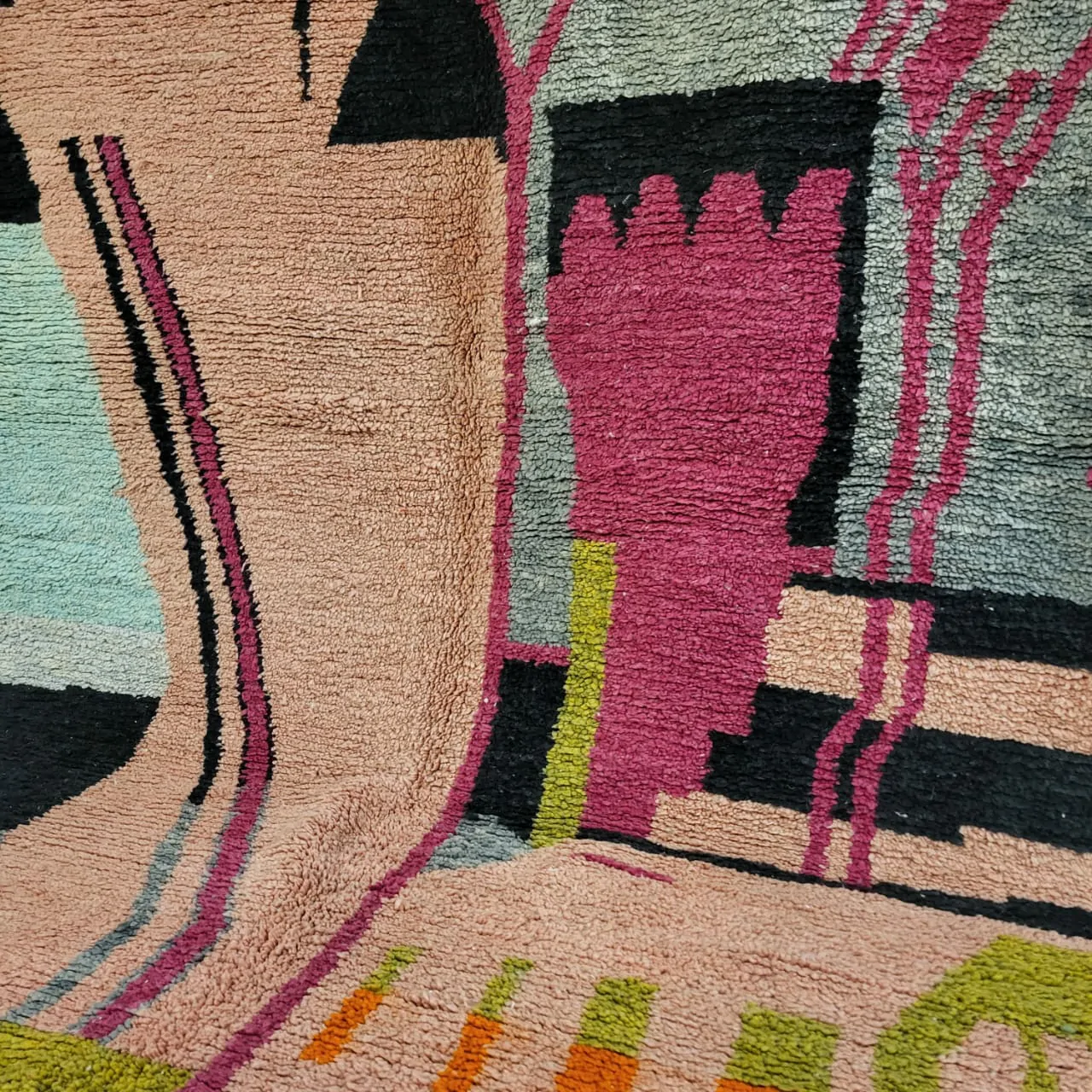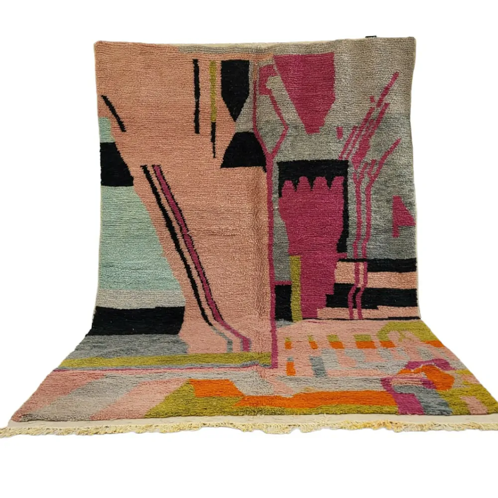 This particular rug is known for its vibrant and bold color palette, which features a mix of warm and earthy tones such as red, pink, orange, and brown. The design is characterized by its abstract patterns, asymmetrical shapes, and intricate geometric motifs, which give the rug a distinct and one-of-a-kind appearance.
