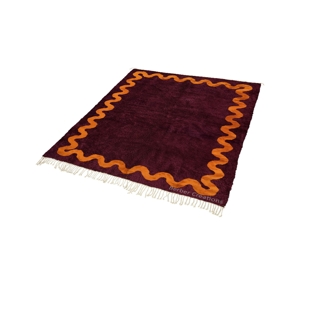 This hand-woven Berber rug commands attention with its rich plum burgundy field and striking burnt orange wavy border. Crafted from premium natural wool, this piece offers a luxurious, high-contrast look that bridges the gap between traditional craftsmanship and bold, modern maximalism.