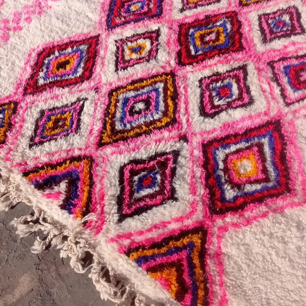 The designs of Azilal rugs are often inspired by Berber symbols and traditions. They may include geometric shapes, diamonds, stripes, and other motifs.